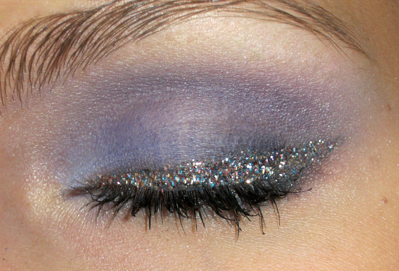 W rzeczywistości makijaż był trochę mocniejszy oraz brokat był nieco bardziej widoczny. Ciężko było mi to uchwycić na zdjęciu. W przypadku zastosowania brokatu w taki sposób dobrze jest mieć sypki cień w tym samym odcieniu, aby granica między brokatem a cieniem nie była taka wyraźna. Ja użyłam złotego brokatu APC, złotego cienia sypkiego KOBO oraz matowego cienia KOBO 'aubergine'. Brokat najlepiej przykleić za pomocą płynnych baz pod cienie ( ja użyłam żelu z APC), możecie także użyć kleju do rzęs bądź bezbarwnego błyszczyka. Aby nie świecić brokatem na całej twarzy jak bombka choinkowa, najpierw pomalujcie oczy, a potem twarz. Drobinki brokatu, które przyczepią się do twarzy możecie łatwo usunąć przykładając w te miejsca kawałek taśmy klejącej.